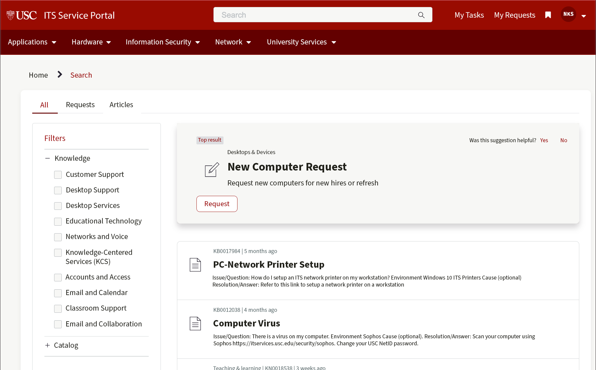 The search results page had a number of cosmetic issues come up that threw users out of our established user experience, which made the whole search process seem unfinished and broken. First, when arriving at this page, our font was disabled across the whole page which threw users off as they felt like something was wrong with their computer and that they needed to submit a support ticket to resolve yet another issue. Second, a lot of the colors reverted back to ServiceNow’s default color pallete which didnt match match the other pages in the portal or anything else at USC. This led to an increased number of support tickets, calls to our support center and a user experience that made it feel as if something was wrong on the user’s end, not with USC.